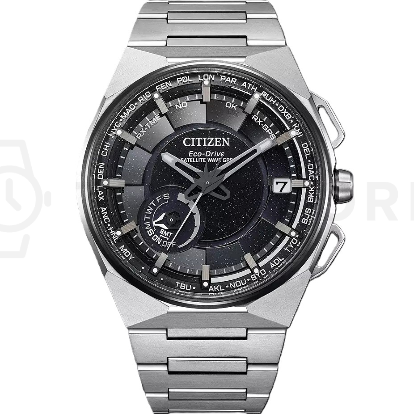 - ora mondiale, calendario perpetuo, GPS, indicatore di carica della batteria, antiurto , resistente ai magneti, doppio tempo, indicatore dei giorni della settimana, lancette luminescenti, indici di luminescenza
