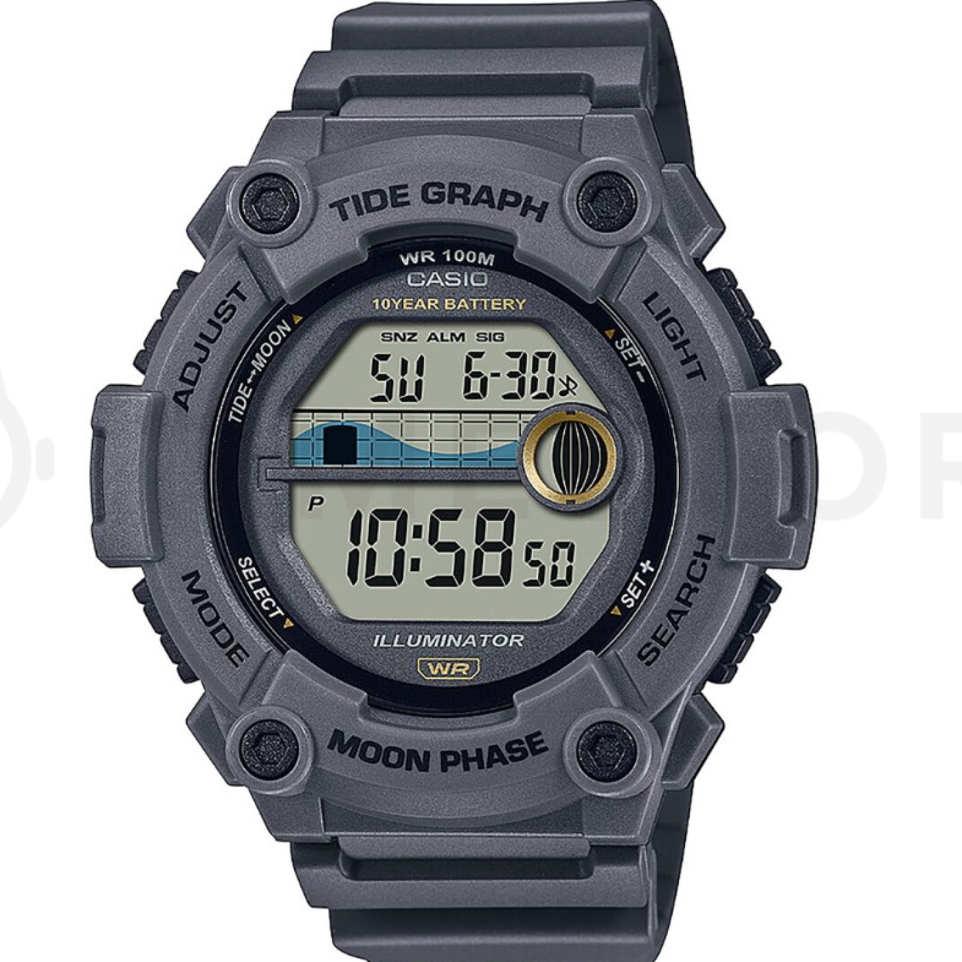 - marea, fasi lunari, cronometro con conto alla rovescia, calendario automatico, allarme, illuminazione